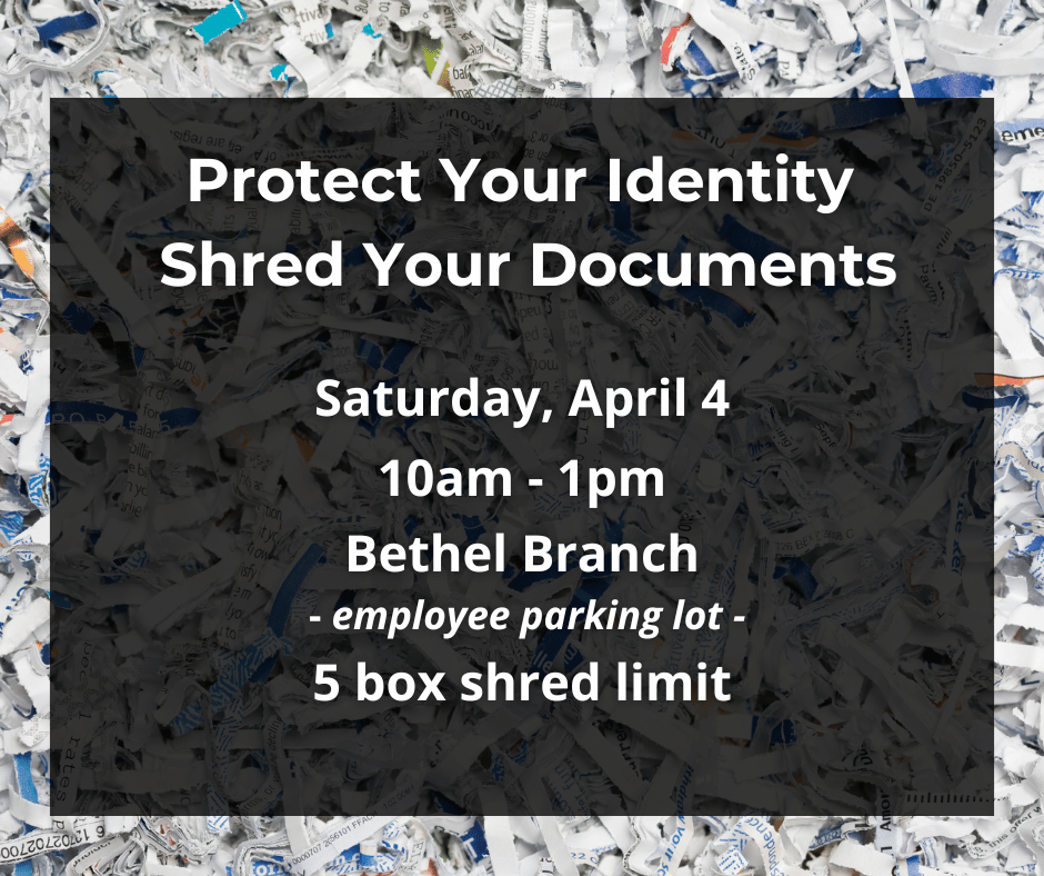 Join us for a Community Shred Day on Saturday, April 4, from 10am to 1pm at the Bethel Branch employee parking lot to securely dispose of your sensitive documents (5 box limit).