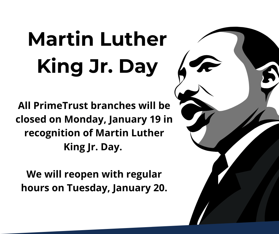 All PrimeTrust branches will beclosed on Monday, January 19 in recognition of Martin Luther King Jr. Day