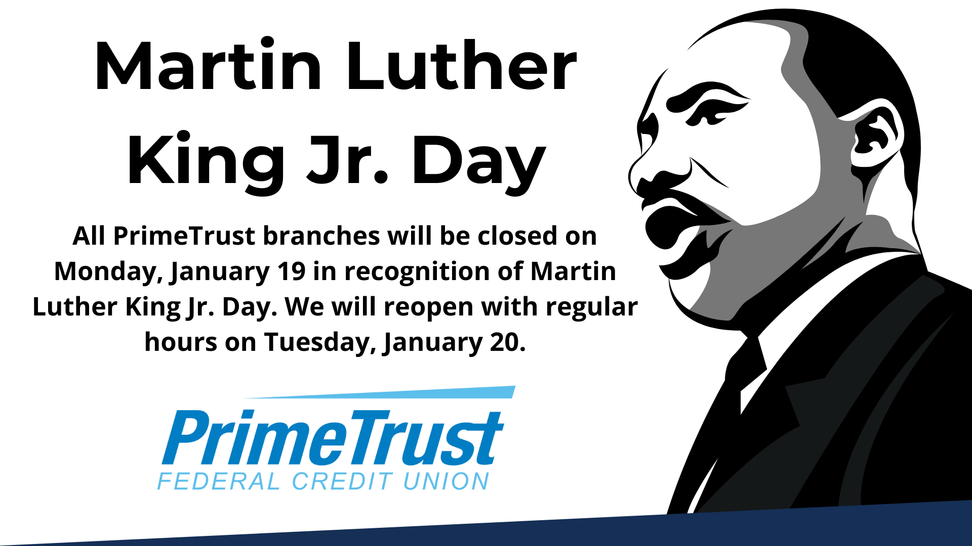Please be advised that all PrimeTrust Federal Credit Union branches will be closed on Monday, January 19, in observance of Martin Luther King Jr. Day.