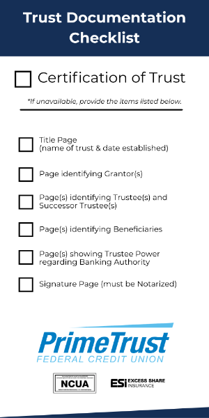 Visit PrimeTrust: Bring your official trust certification to any branch or schedule a virtual appointment. We will help you open a new trust membership to ensure your assets are protected.